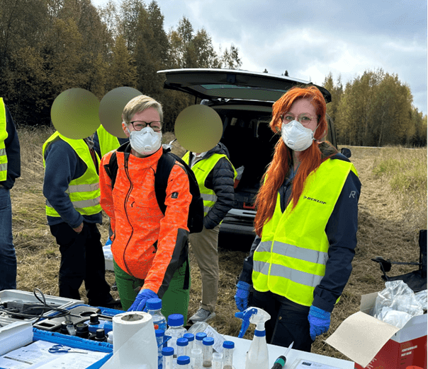 Photo 1. Demonstration of the ÅAU rapid field method protocol at the field site in the vicinity of Luleå. Miriam Nystrand and I demonstrated the method while Peter Österholm presented the details. Photo: Peter Österholm. Edited by Alexandra Nyberg.